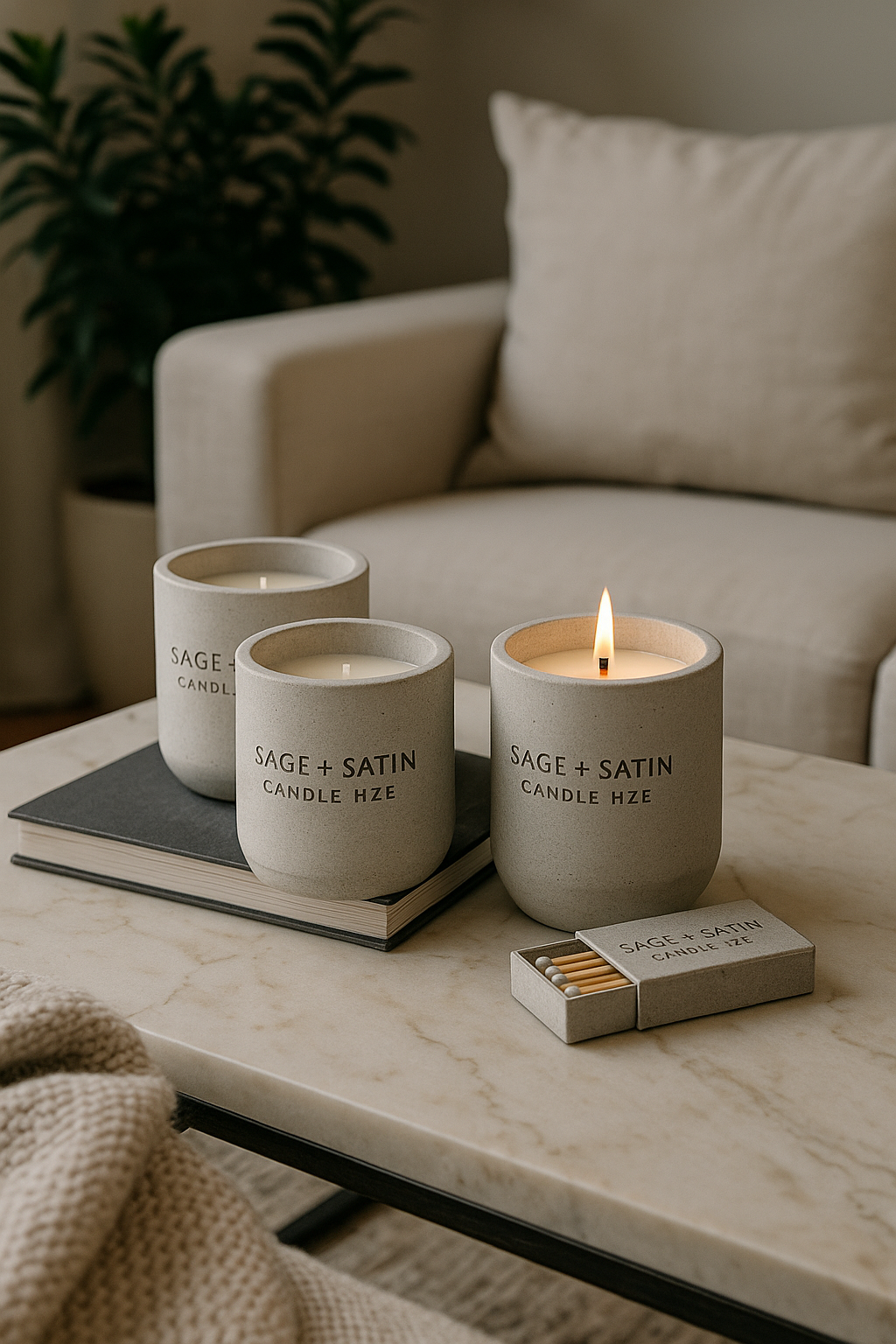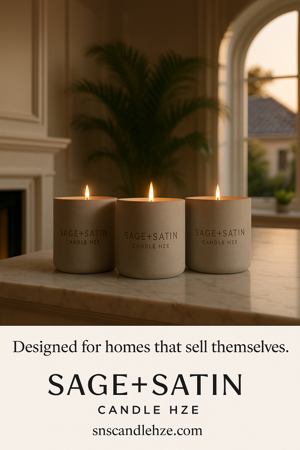 Sage + Satin Candle Hze curates atmosphere. Each vessel transforms a property into an experience, where luxury, scent, and design merge to influence emotion and investment
